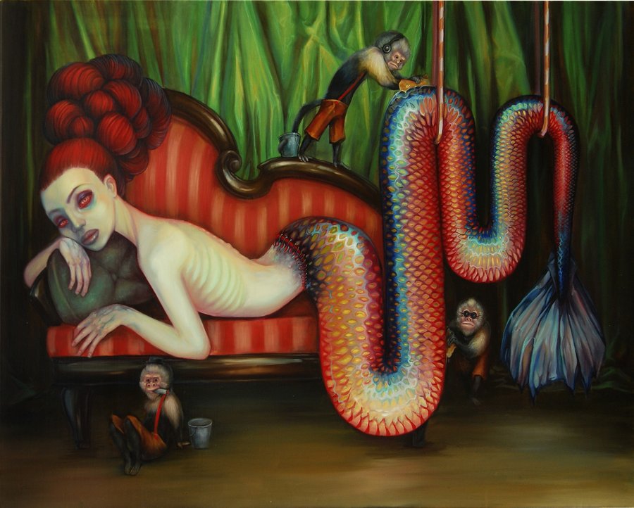 mantenerme a mí mismo, tengo ocho o menos años de servicio al cliente / al por menor en mi haber (en su mayoría en los sectores comercial / ventas arte para turistas, donde estoy trabajando en en este mismo momento). Todos los que tratan con el público me ha hecho cada vez más amarga, y ahí es donde mi inspiración viene de. Trato de pintar la vanidad, la hipocresía, idiotismo (gran película, por cierto), y la sátira dentro de mi vida ... y la belleza de la fealdad puede ser. Todo esto con el drama y la expresión para que sea realmente interesante. Espero que ...."